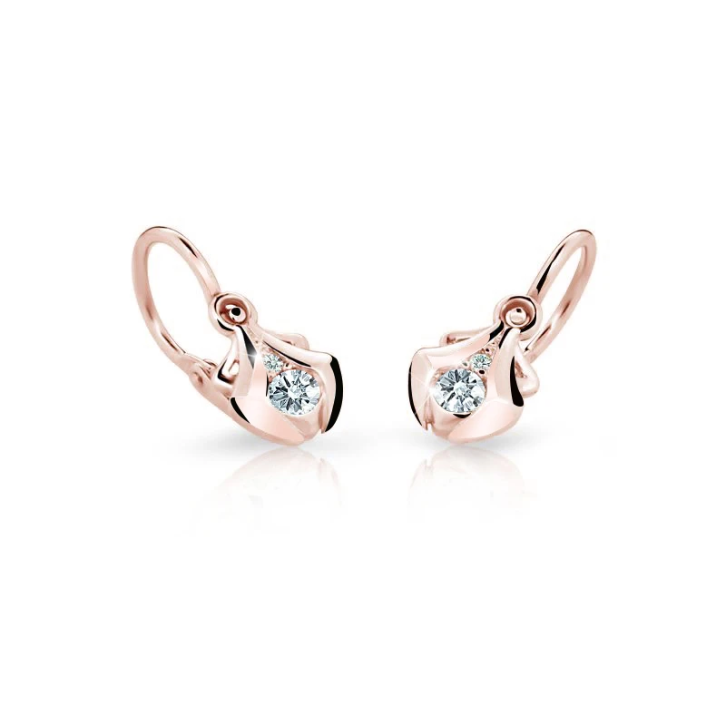 Dětské náušnice vyrobené z růžového zlata 585/1000. Náušnicové zapínání je na dětskou brizuru. Toto zapínání je zkonstruované právě pro dětské náušnice a zamezuje jeho nechtěnému rozevření a následné ztrátě náušničky. Rozměry náušniček 5,8mm x 5,7mm x 13mm najdete přehledně zobrazené na podpůrné fotografii. Náušničky jsou osazené zářivými zirkony.