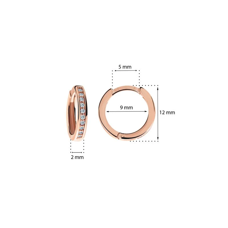 Dětské náušnice kroužky z růžového zlata. Praktický kruhový tvar dětských náušniček je zárukou jejich pohodlného užívání. Vnitřní průměr náušniček 9mm, vnější průměr 12mm. Náušničky jsou široké 2,0 mm. Dřík zapínání je dlouhý 5 mm.