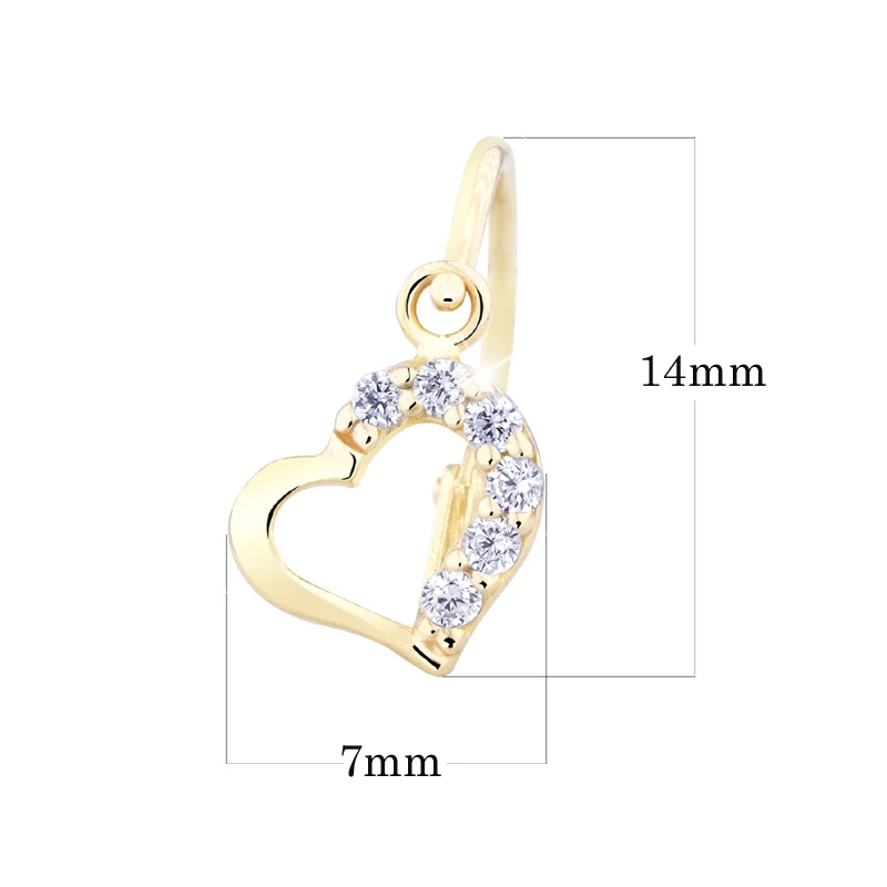 Dětské náušnice srdíčka ze žlutého 14ti karátového zlata. Náušnice jsou zkonstruované a vyrobené s ohledem na bezpečné a komfortní užívání pro princezny od nejútlejšího věku. Zapínání náušniček na dětskou brizuru zamezuje jejich snadnému otevření a následné ztrátě dětské náušničky. Srdíčko se zirkony má rozměr 7×7 mm, celková „výška“ náušničky 14 mm. Rozměry náušniček najdete přehledně zobrazené na podpůrné fotografii.