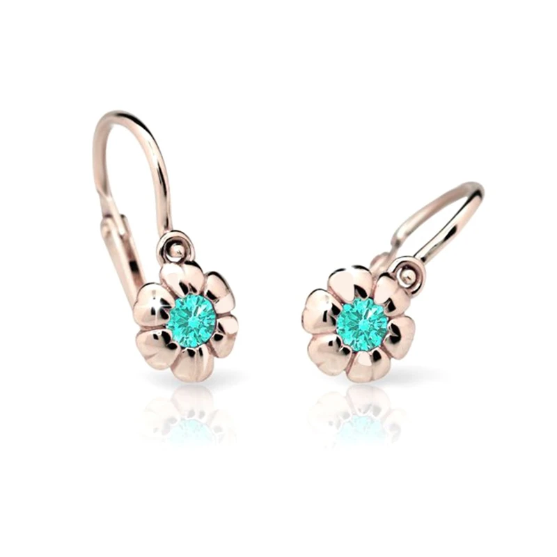 Dětské náušnice z růžového zlata ryzosti 585/000. Povrch náušnic je leštěný. Náušnice s ozdobou květu. Ve středu květu je zirkon. Rozměry náušničky najdete zobrazené na podpůrném obrázku. Náušnice mají bezpečnostní dětské zapínání na brizuru. Krásné dětské náušnice od českého výrobce CUTIE JEWELLERY. Uvedená cena za 1 pár.