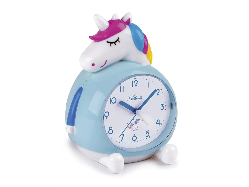 Velký budík pro děti "Jednorožec". Budík má hodinovou, minutovou a vteřinovou ručku. Po stisknutí sklíčka ciferníku se rozsvítí jeho osvětlení. Budík má funkci alarmu s možností volby melodie, či tónu. Alarm se aktivuje-deaktivuje stlačením stříbrného tlačítka umístěného za hlavou jednorožce. Průměr ciferníku 100 mm. Výška budíku 150 mm, šířka 140 mm, hloubka 105 mm. Pohon budíku je bateriový na 2 baterie typu AA. Baterie jsou součástí balení.