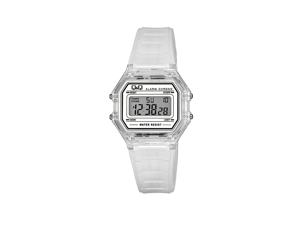 Retro digitálky s plastovým průhledným pouzdrem a průhledným řemínkem ze silikonu se zapínáním na jednoduchou sponu. Hodinky ukazují den v týdnu, datum, aktuální čas s možností přepínání zobrazení 12/24. Hodinky umožnují nastavení dvou rozdílných časů. Dále hodinky disponují funkcemi: alarm, stopky. timer, podsvícený display, kalendář. Rozměr pouzdra 34x30mm, řemínek je široký 16mm. Zadní víčko je z chirurgické oceli. Hodinky jsou vodotěsné na úrovni 3ATM.