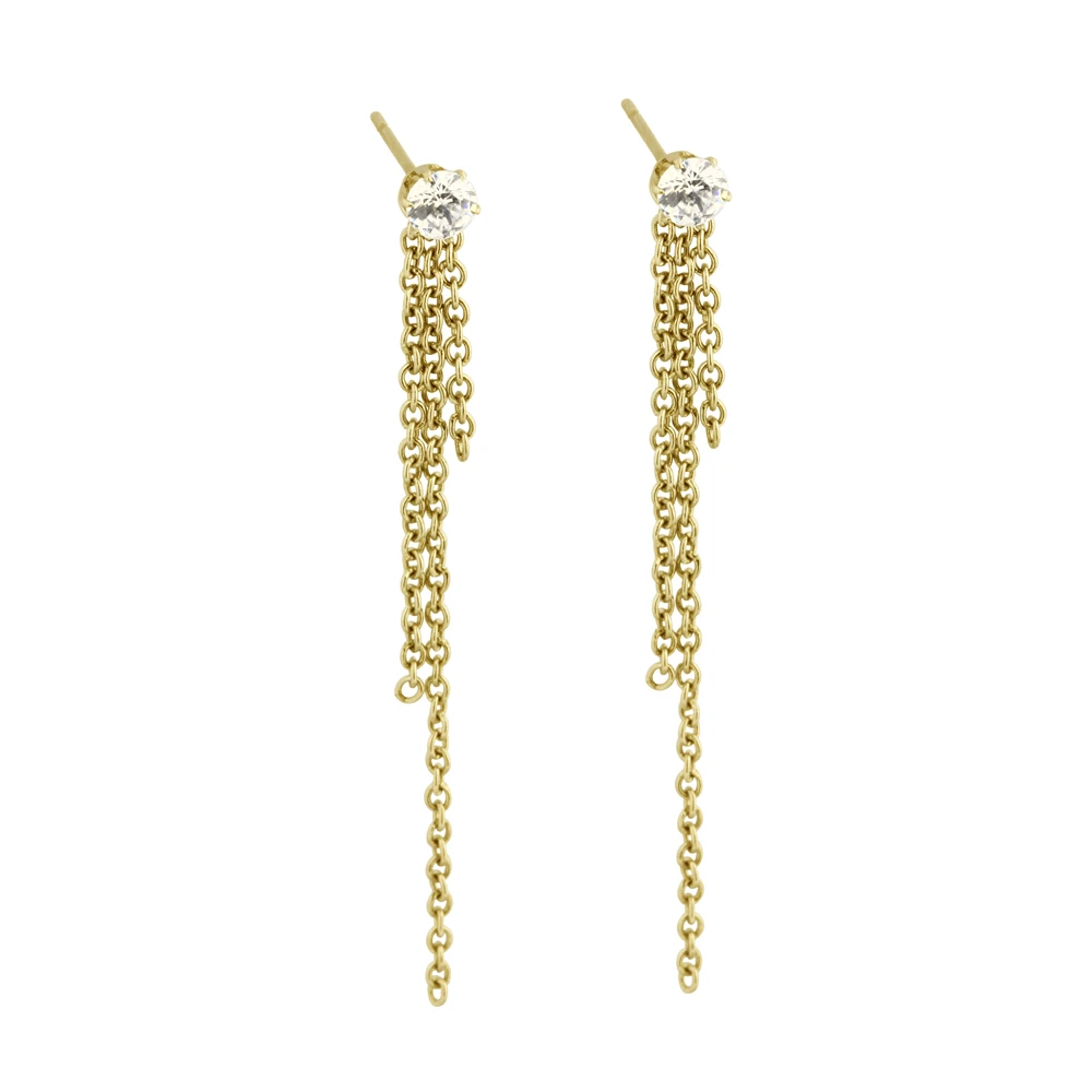 Zlaté ocelové visací náušnice se zirkonem a řetízky. Řetízky lze z náušnice jednoduše sundat a náušnice tak používat jako jednoduché pecky. Povrch náušnic je pozlacený technologií IP. Průměr ozdoby se zirkonem 4mm, Řetízková část náušnic je dlouhá 50mm. Náušnicové zapínání je na puzetu. Uvedená cena platí za pár náušnic.