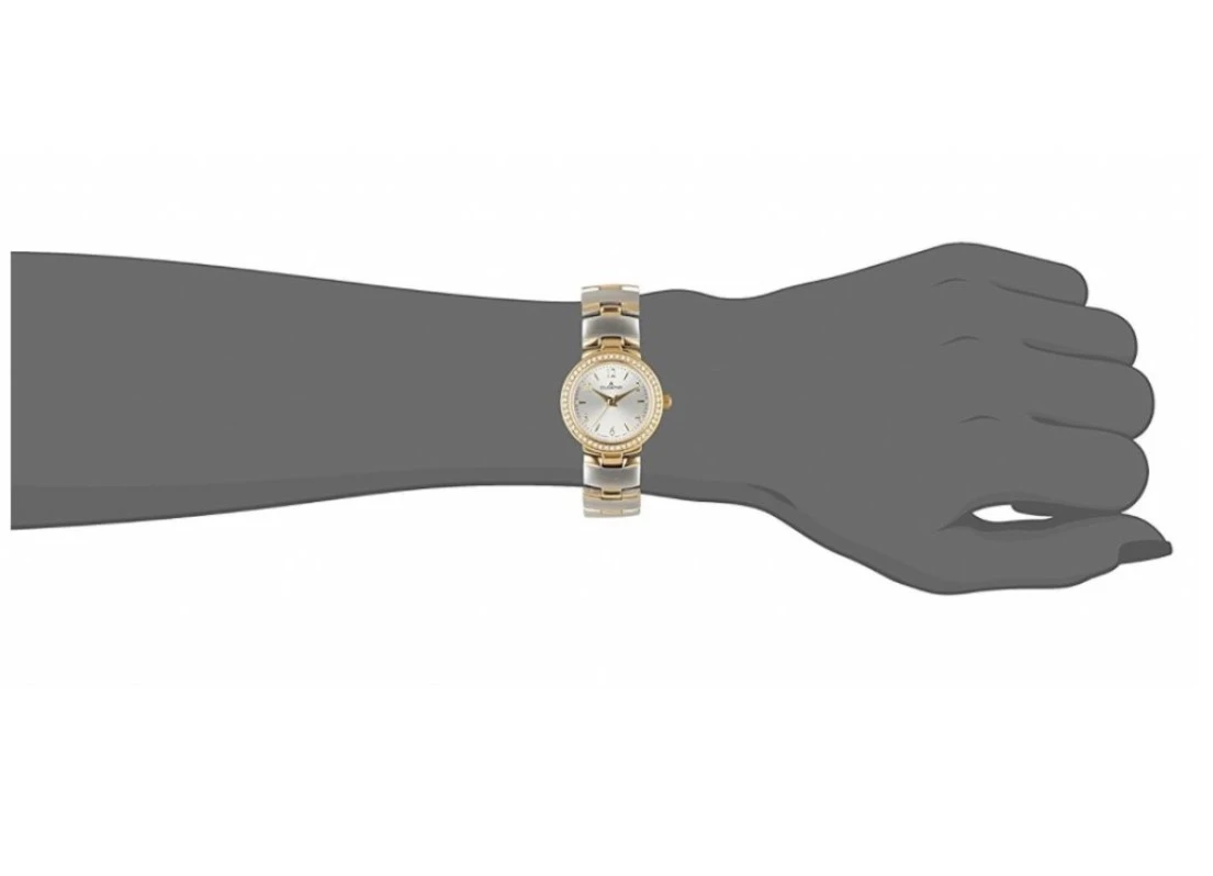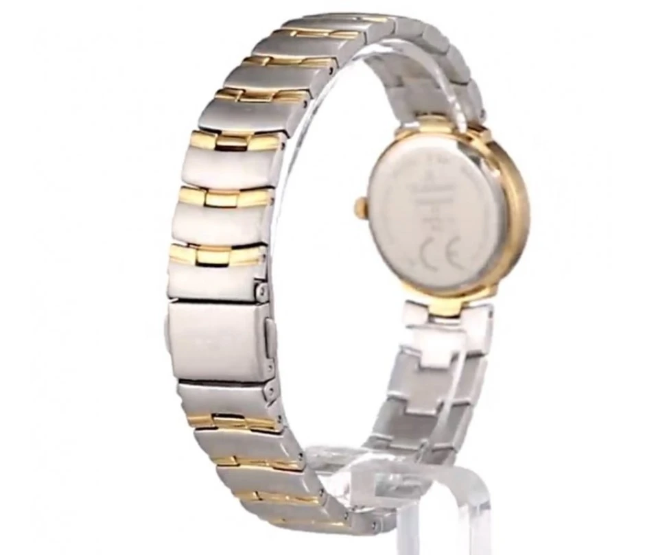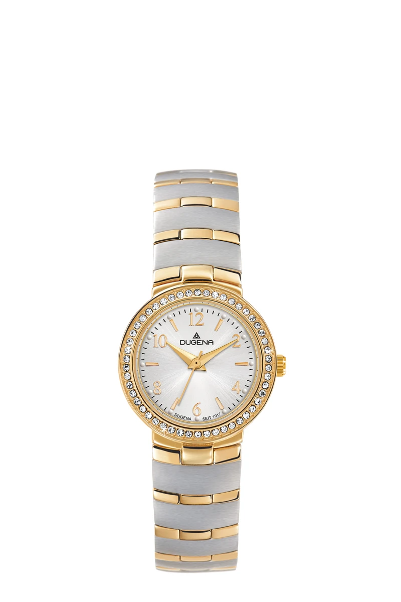 Dámské náramkové hodinky pro ženy a dívky z chirurgické oceli. Hodinky mají stříbrný ciferník se zlatým arabským číselníkem a indexy, zlatou hodinovou, minutovou a vteřinovou ručku. Luneta je ozdobená zářivými kamínky. Zlacené prvky hodinek jsou pozlacené žlutým zlatem pomocí technologie IP. Náramek z chirurgické oceli je kombinace matu a pozlacených částí. Rozměr pouzdra 19x25x6,5 mm. Provoz hodinek zajišťuje bezproblémový bateriový strojek. Hodinky jsou vodotěsné na úrovni 3 ATM. Všechny dámské hodinky Dugena jsou dodávané v krabičce s logem. Na hodinky Dugena se vztahuje záruka v délce 36 měsíců.