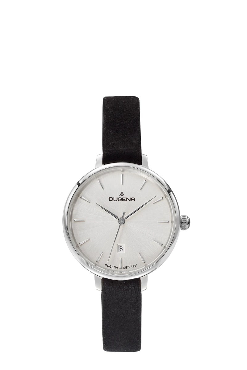 Dámské elegantní ocelové hodinky Dugena s koženým řemínkem,sklíčko hodinek je minerální. Na výrobu pouzdra hodinek byla použita chirurgická ocel. Kulatý stříbrný ciferník se stříbrnými indexy. Hodinky jsou vybavené ukazatelem data, hodinovou, minutovou a vteřinovou ručkou. Pouzdro hodinek má průměr 30 mm. Provoz hodinek zajišťuje spolehlivý bateriový strojek. Hodinky jsou vodotěsné na úrovni 3 ATM. Na veškeré dámské hodinky Dugena platí záruka v délce 36 měsíců. Hodinky jsou balené v dárkové krabičce s logem.