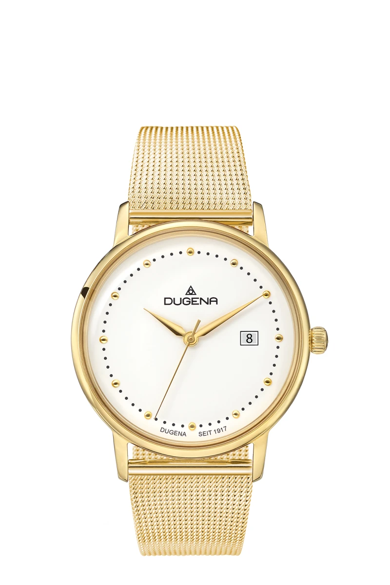 Dámské hodinky Dugena z chirurgické oceli s milánským tahem, sklíčko hodinek je minerální. Kulatý bílý ciferník s indexy. Hodinky jsou vybavené datumkou, hodinovou, minutovou a vteřinovou ručkou. Velikost pouzdra 38,5 x 9,5 mm. Povrch hodinek je pozlacený žlutým zlatem technologií PVD. Chod hodinek zajišťuje spolehlivý bateriový strojek. Hodinky jsou vodotěsné na úrovni 3 ATM. Na všechny dámské hodinky Dugena platí záruka v délce 36 měsíců. Hodinky jsou dodávané v dárkové krabičce s logem.