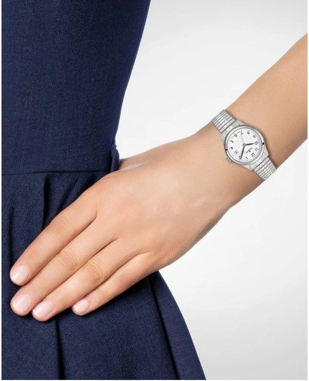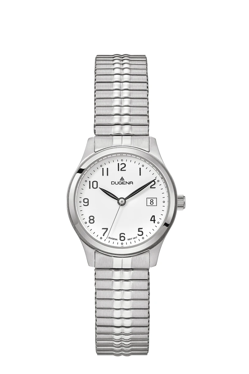 Dámské hodinky z chirurgické oceli s natahovacím náramkem. Díky, svému pružnému náramku a přehlednému bílému ciferníku s černým číselníkem jde o velmi oblíbený typ dámských náramkových hodinek. Pouzdro hodinek má průměr 28 mm. Hodinky jsou disponují datumkou, hodinovou, minutovou a vteřinovou ručkou. Sklíčko hodinek je minerální. Hodinky jsou voděodolné na úrovni 5 ATM. Provoz těchto dámských hodinek zajišťuje spolehlivý bateriový strojek. Všechny dámské hodinky Dugena jsou dodávané v originální krabičce.
