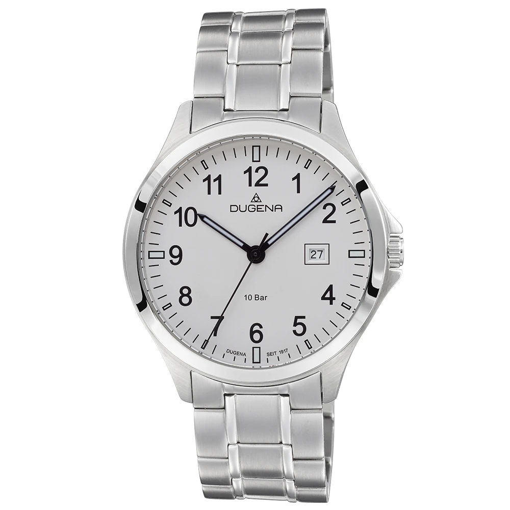 Pánské hodinky na ruku z chirurgické oceli, sklíčko hodinek je minerální. Kulatý bílý ciferník s arabskými číslicemi. Hodinky jsou vybavené datumkou, hodinovou, minutovou a vteřinovou ručkou. Průměr pouzdra hodinek 42mm, výška pouzdra 9mm. Pouzdro hodinek a náramek jsou vyrobené z chirurgické oceli. Chod hodinek zajišťuje spolehlivý bateriový strojek. Hodinky jsou vodotěsné na úrovni 10 ATM. Na všechny hodinky Dugena platí záruka v délce 36 měsíců. Hodinky jsou dodávané v dárkové krabičce s logem.