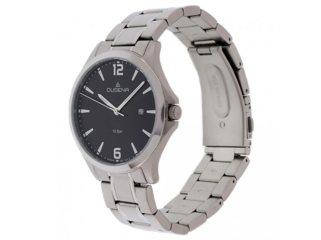 Pánské hodinky na ruku z chirurgické oceli, sklíčko hodinek je minerální. Kulatý černý ciferník s indexy. Hodinky jsou vybavené datumkou, hodinovou, minutovou a vteřinovou ručkou. Průměr pouzdra hodinek 42mm, výška pouzdra 9mm. Pouzdro hodinek a náramek jsou vyrobené z chirurgické oceli. Chod hodinek zajišťuje spolehlivý bateriový strojek. Hodinky jsou vodotěsné na úrovni 10 ATM. Na všechny hodinky Dugena platí záruka v délce 36 měsíců. Hodinky jsou dodávané v dárkové krabičce s logem.