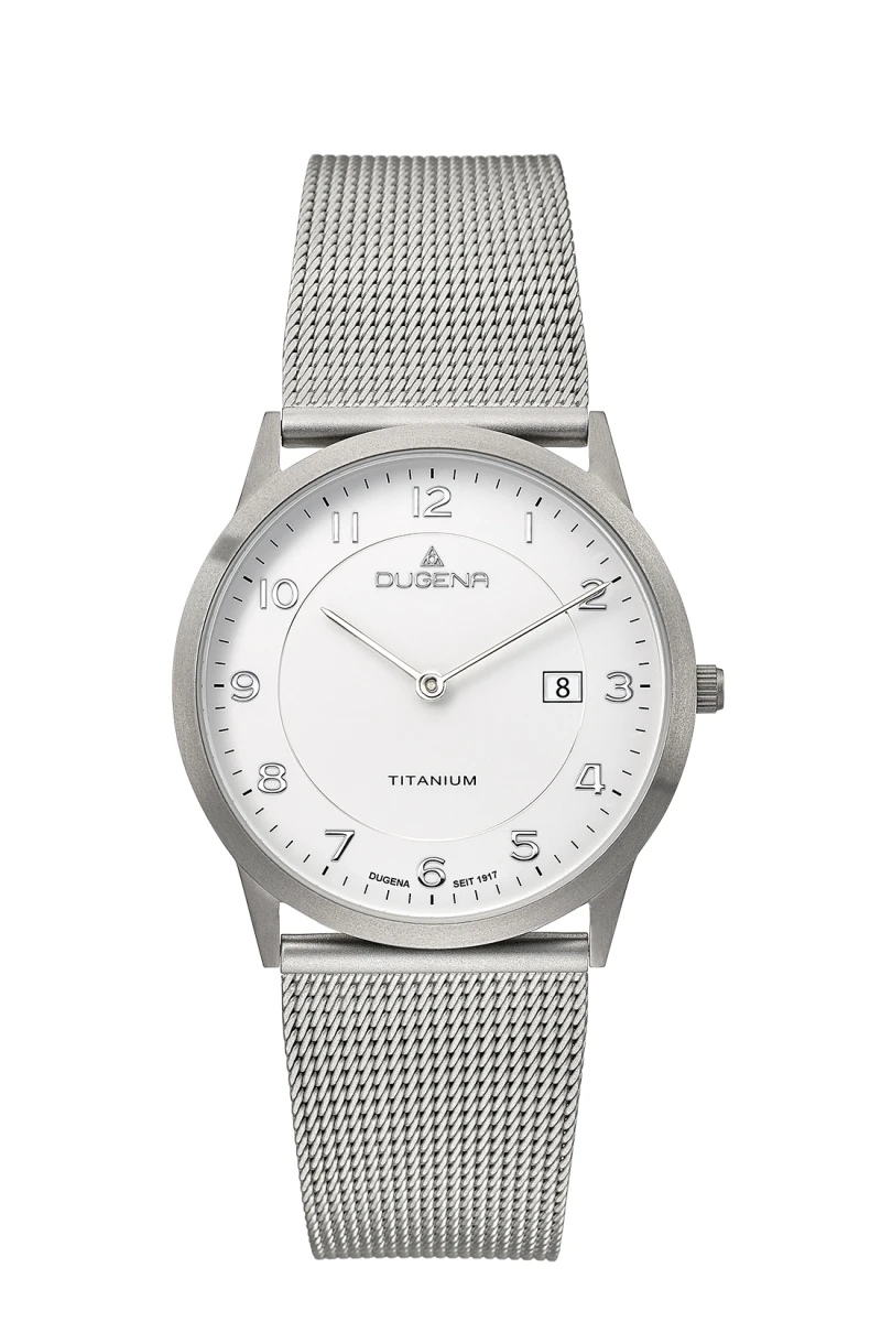 Hodinky na ruku Dugena s pouzdrem z titan a ocelovým náramkem se zapínáním na jednoduchou přezku, sklíčko hodinek je minerální. Kulatý bílý ciferník s arabskými čísly. Hodinky jsou vybavené datumkou, hodinovou a minutovou ručkou. Velikost pouzdra 38x7 mm. Provoz hodinek zajišťuje spolehlivý bateriový strojek. Hodinky jsou vodotěsné na úrovni 3 ATM. Na všechny hodinky Dugena platí záruka v délce 36 měsíců. Hodinky jsou dodávané v dárkové krabičce s logem.