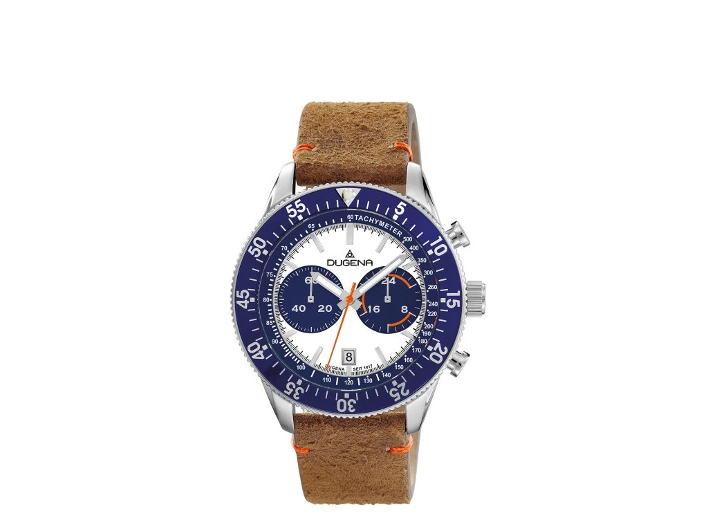 Pánské hodinky Dugena s koženým řemínkem z hrubé kůže, sklíčko hodinek je minerální. Hodinky mají kulatý bílý ciferník se stříbrnými indexy a modrým chronografem. Hodinky jsou vybavené datumkou, hodinovou, minutovou a vteřinovou ručkou, chronografem, tachymetrem a otočnou lunetou. Průměr pouzdra hodinek 42mm, výška pouzdra 12mm. Pouzdro hodinek je vyrobené z chirurgické oceli. Chod hodinek zajišťuje spolehlivý bateriový strojek. Hodinky jsou vodotěsné na úrovni 10 ATM. Na všechny hodinky Dugena platí záruka v délce 36 měsíců. Hodinky jsou dodávané v dárkové krabičce s logem.