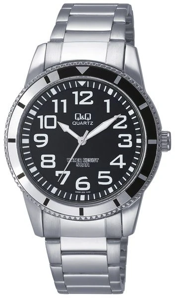 Náramkové hodinky Q+Q. Levné hodinky s bateriovým strojkem. Hodinky disponují hodinovou, minutovou a vteřinovou ručkou. Ciferník má průměr 32mm, rozměr kovového pouzdra 49×40mm. Tah je široký 18mm. Náramkové hodinky balené do plastové krabičky s průhledným víčkem.