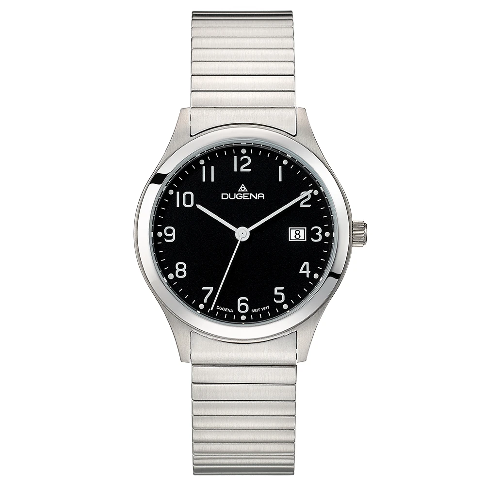 Pánské hodinky z chirurgické oceli s natahovacím náramkem. Díky pružnému náramku a přehlednému černému ciferníku s bílým číselníkem jde o velmi oblíbený typ pánských náramkových hodinek. Pouzdro hodinek má průměr 37mm. Hodinky disponují datumkou, hodinovou, minutovou a vteřinovou ručkou. Sklíčko hodinek je minerální. Hodinky jsou voděodolné na úrovni 5 ATM. Provoz těchto pánských hodinek zajišťuje spolehlivý bateriový strojek. Všechny dámské hodinky Dugena jsou dodávané v originální krabičce.