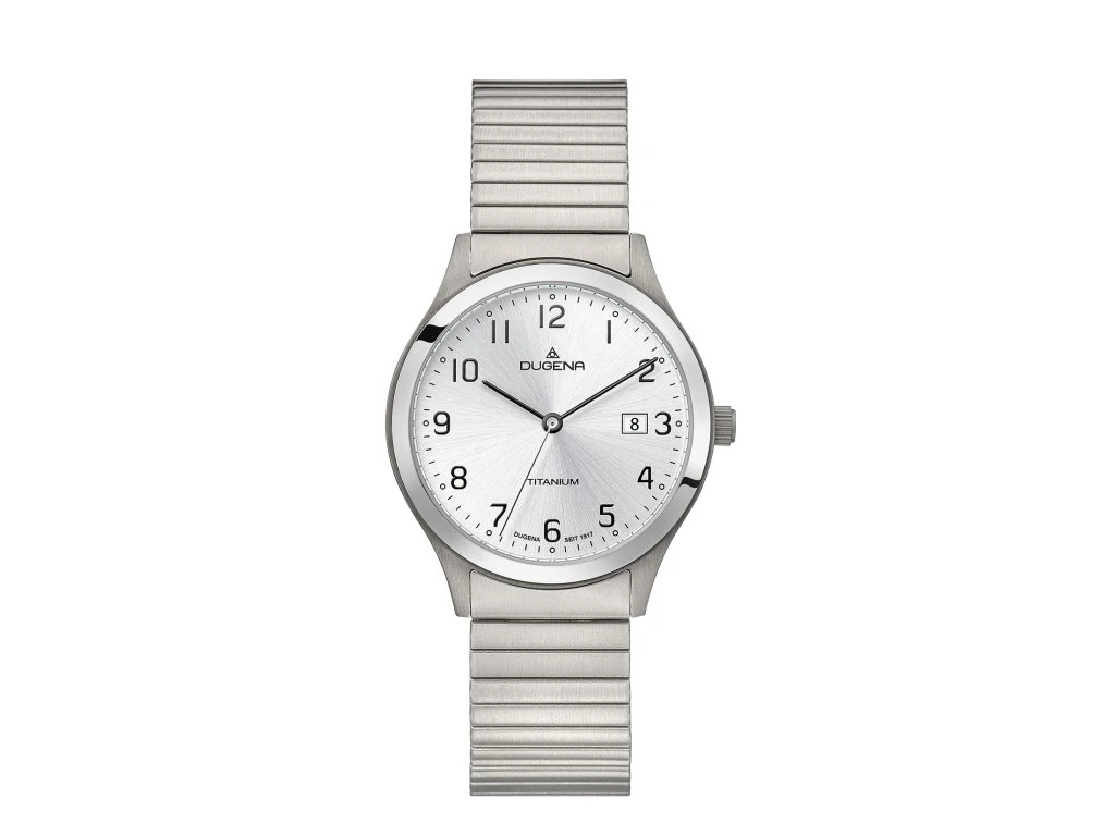 Pánské hodinky z titanu s natahovacím náramkem. Díky, svému pružnému náramku a přehlednému ciferníku s černým číselníkem jde o velmi oblíbený typ pánských náramkových hodinek. Pouzdro hodinek má průměr 378 mm. Hodinky disponují datumkou, hodinovou, minutovou a vteřinovou ručkou. Sklíčko hodinek je minerální. Hodinky jsou voděodolné na úrovni 5 ATM. Provoz těchto pánských hodinek zajišťuje spolehlivý bateriový strojek. Všechny dámské hodinky Dugena jsou dodávané v originální krabičce.