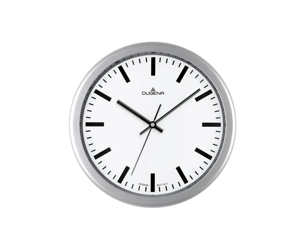Hodiny na stěnu Dugena poháněné přesným a tichým bateriovým strojkem. Tělo hodin je plastové. Hodiny mají vteřinovu, minutovou a hodinovou ručku, bílý ciferník s indexy. Průměr těchto nástěnných hodin 305mm. Hodiny jsou napájené baterií, která je součástí balení. Na všechny hodiny a hodinky Dugena je poskytována záruční doba v délce 36 měsíců.