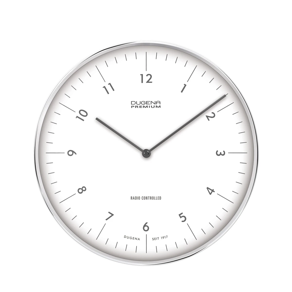 Hodiny na stěnu Dugena řízené radiovým signálem. Tělo hodin je kovové. Hodiny mají minutovou a hodinovou ručku, bílý ciferník s arabským číselníkem. Průměr těchto nástěnných hodin 320mm. Hodiny jsou napájené baterií, která je součástí balení. Na všechny hodiny a hodinky Dugena je poskytována záruční doba v délce 36 měsíců.