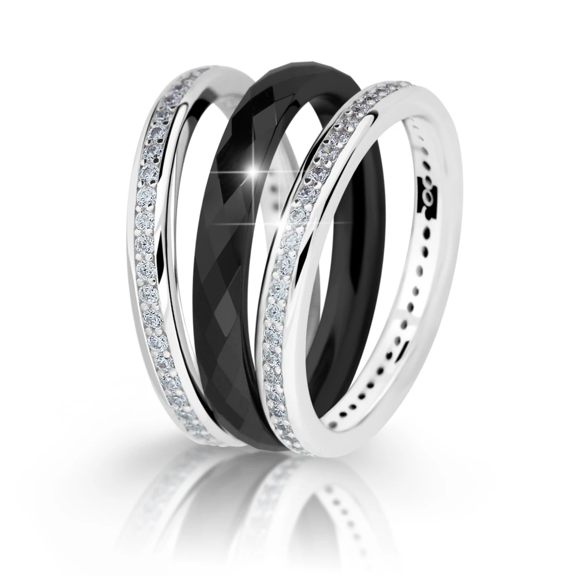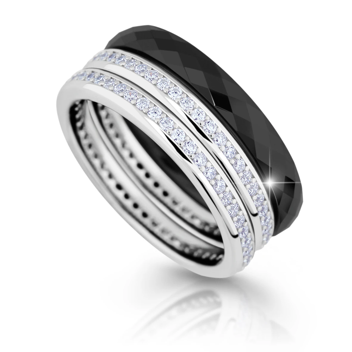 Dámský prsten tvořený třemi, na sobě zcela nezávislými prstýnky. Černý prstýnek je z keramiky, prstýnky osazené kubickými zirkony jsou ze stříbra 925/1000. Stříbrné prstýnky se zirkony mají porhodiovaný povrch. Úprava rhodiováním dodává šperku zářivou barvu a lesk. Prsten je široký 9mm. Jakou kombinace kroužků zvolíte záleží zcela na Vás.