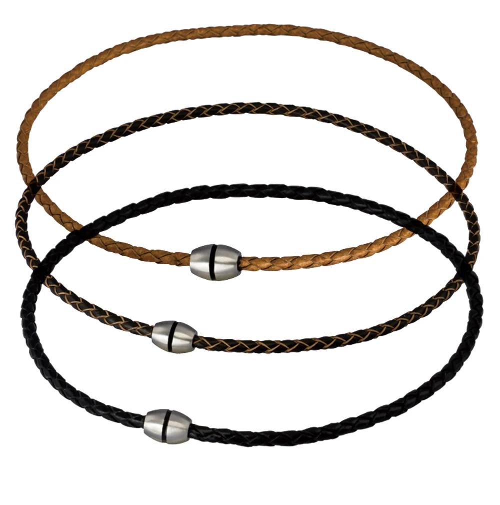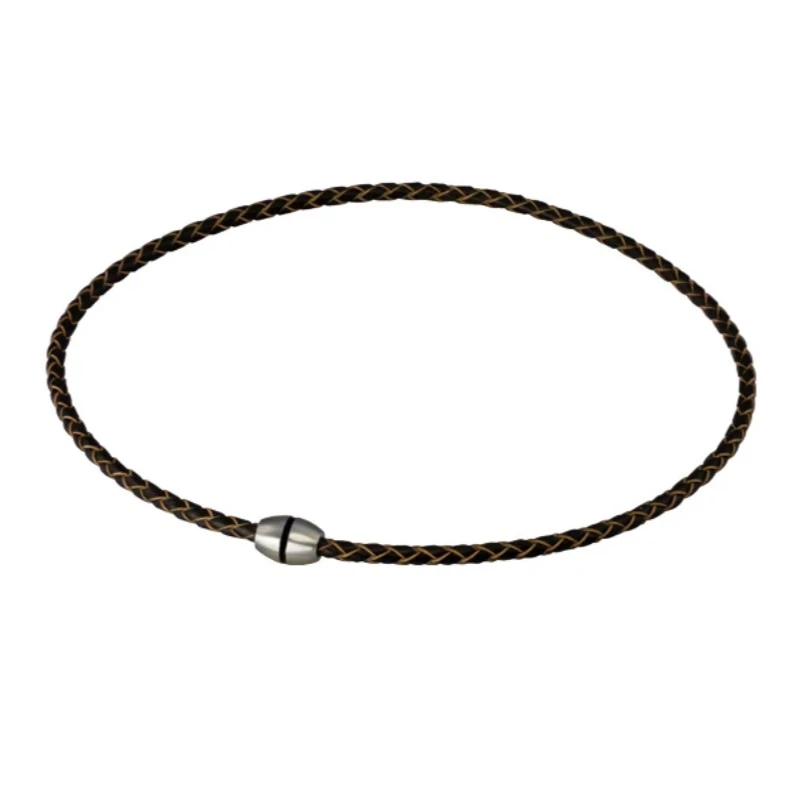 Pánský kožený náhrdelník s ozdobným zapínáním. Magnetické zapínání z chirurgické oceli má matný povrch, po obvodu zdobený černým proužkem. Průměr zapínání 10mm. Kožená pletená část náhrdelníku má průměr 4mm, délka náhrdelníku 45cm.