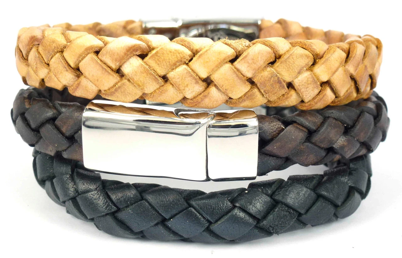Pánský kožený náramek. Masivní zapínání z leštěné oceli. Spletená kůže má oválný profil široký 11mm. Délka 21cm. Kožený náramek pro muže Bandito.