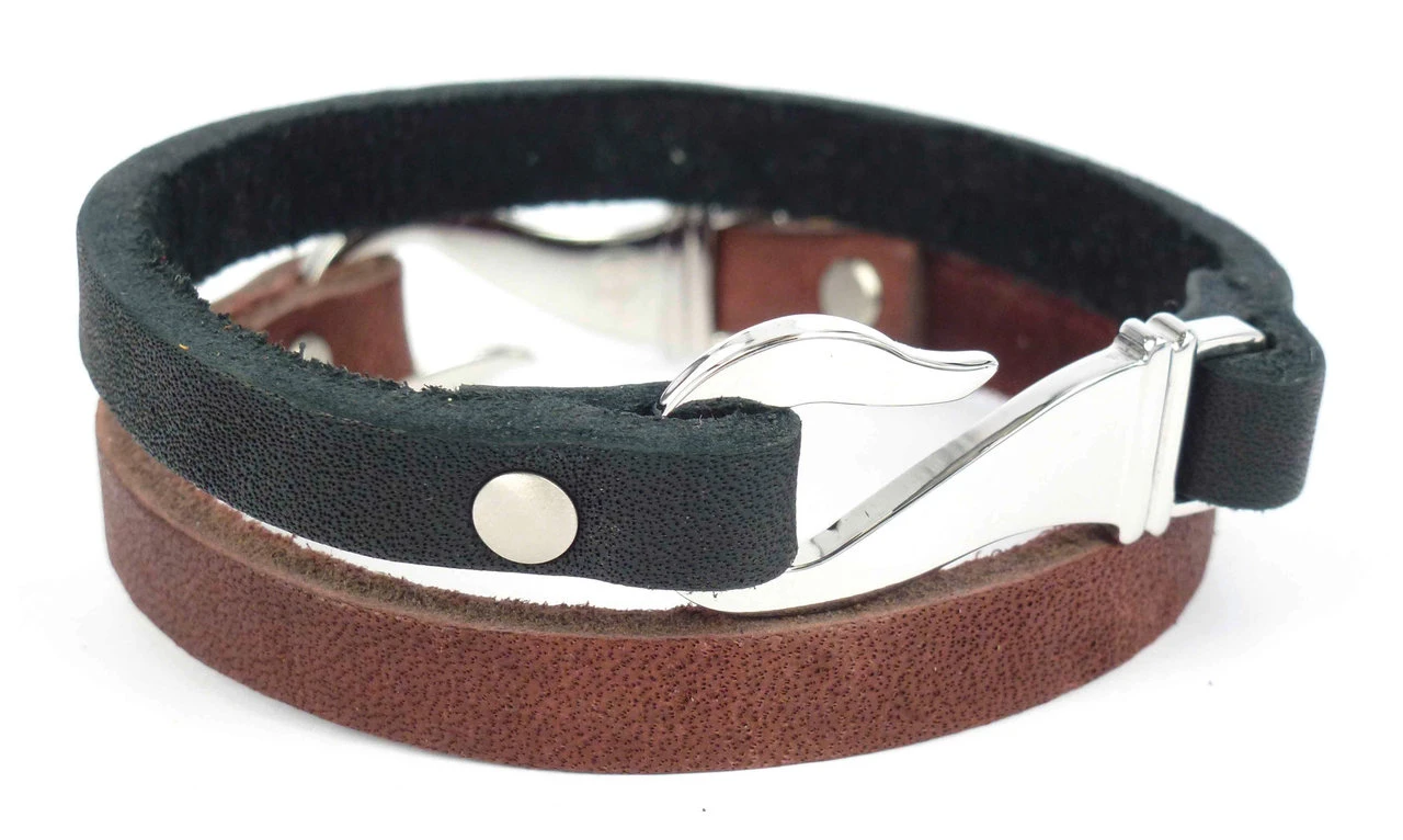 Náramek Bandito. Náramek je kombinace kůže a chirurgické oceli 316L. Kožený „pásek“ je široký 7mm. Ocelové zapínání má leštěný povrch. Hezká kombinace chirurgické oceli a kůže. Náramek je dlouhý 21cm.