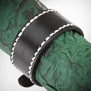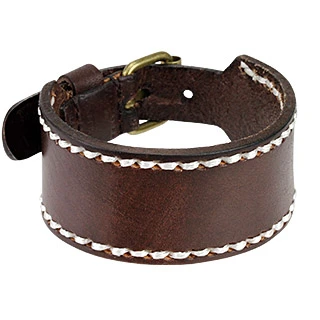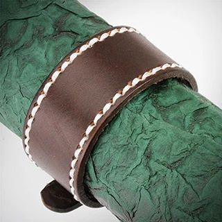 Náramek z kůže prošitý bílou nití. Zapínání náramku je na jednoduchou přezku. Náramek je široký 35mm zapínací část je široká 17mm. Náramek lze zapínat na úrovni délek 19,20,21,22,23cm.