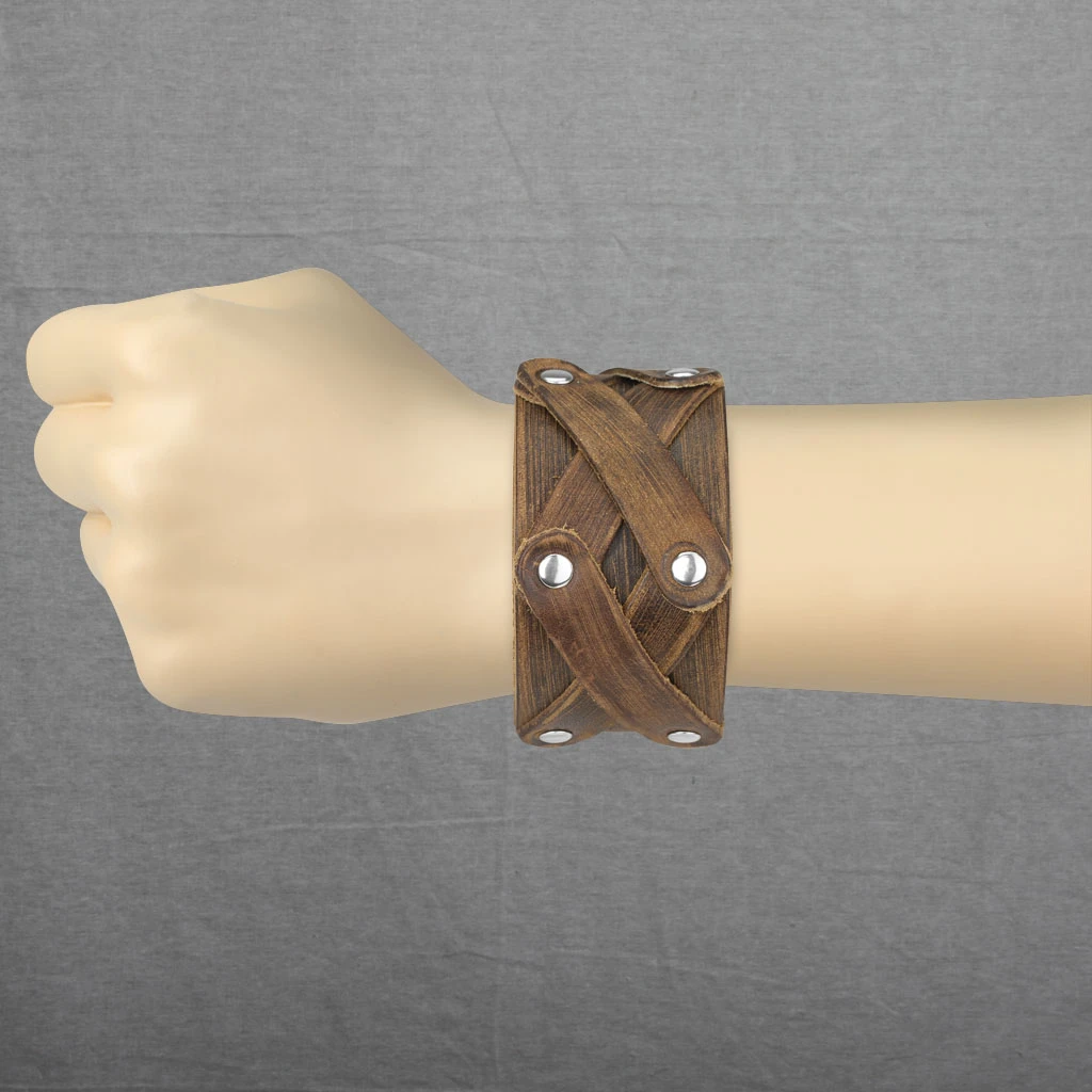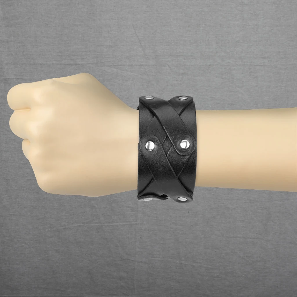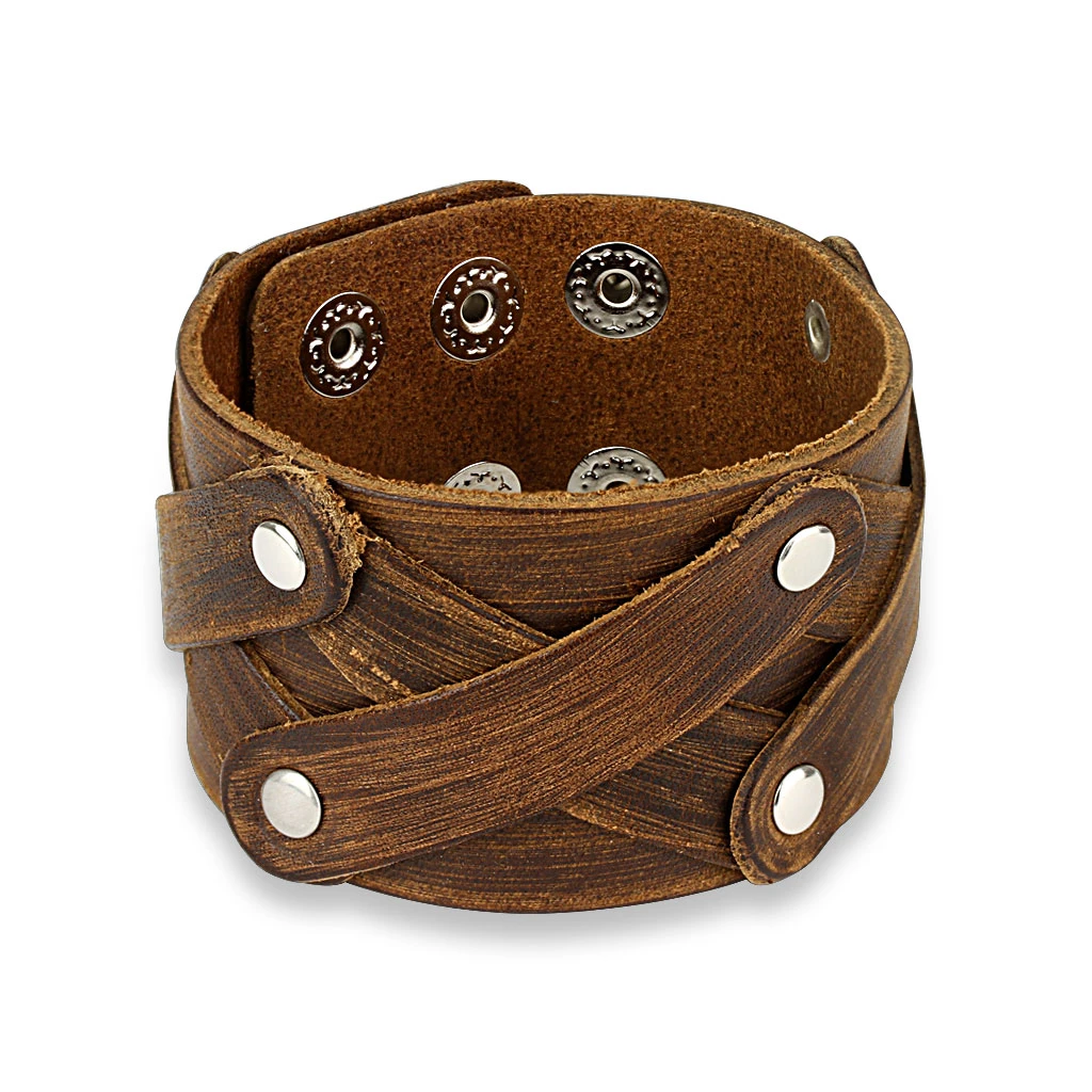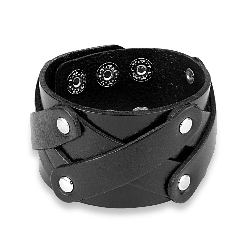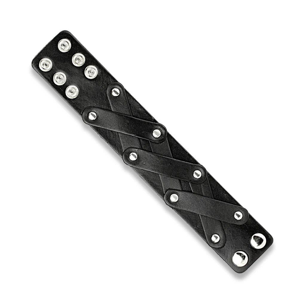 Kožený náramek pro muže se zapínáním na patentky. Náramek je široký 40mm. Široký kožený náramek ozdobený kovovými cvočky. Dvojité zapínání na patentky lze zapínat na úrovni délek 19,21,22cm.