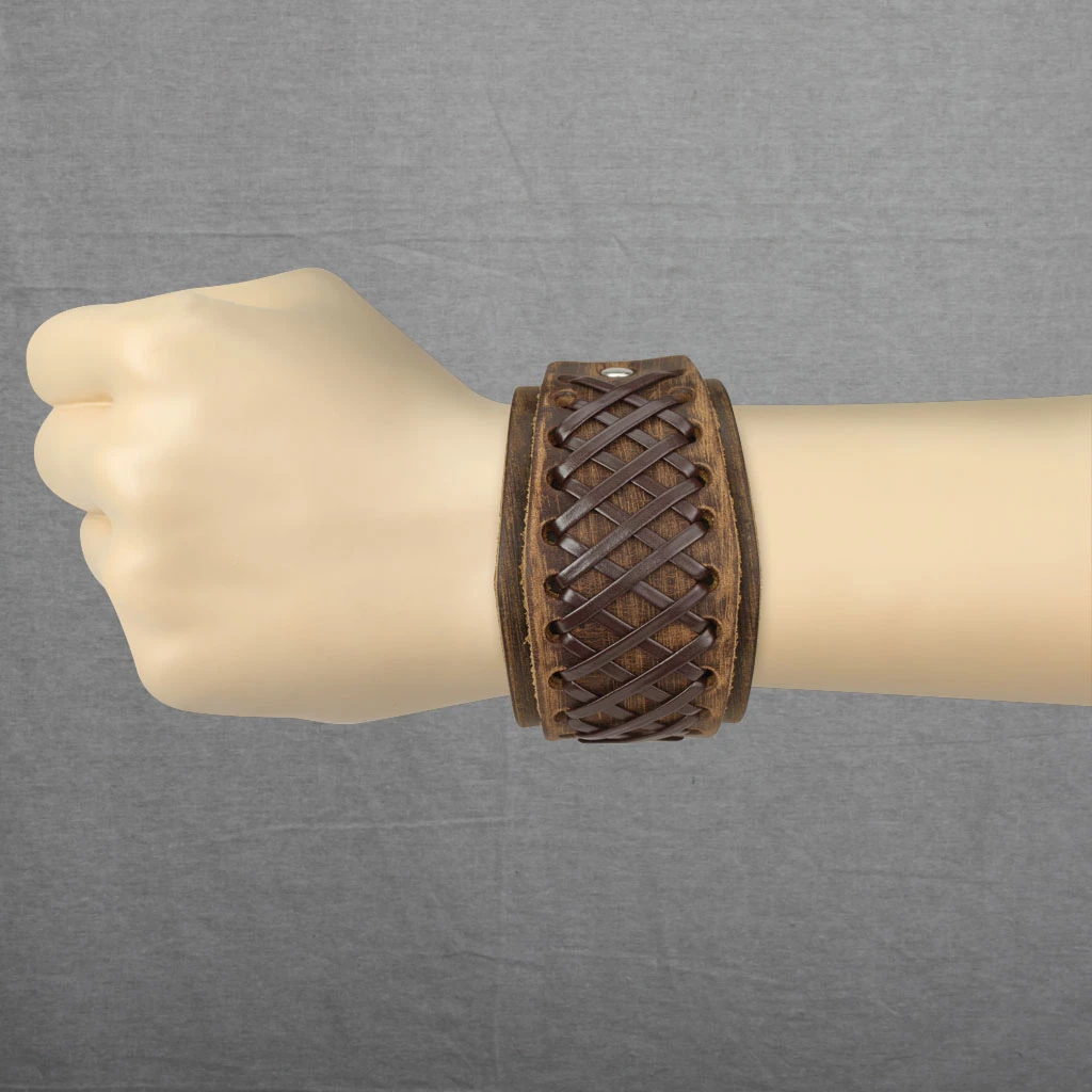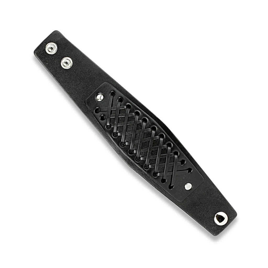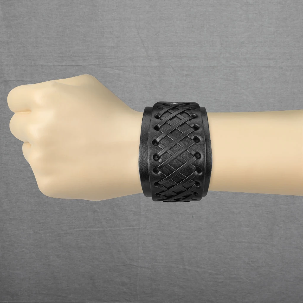 Náramek z kůže s patentním zapínáním. Náramek je v nejširším bodě široký 50mm a postupně se zužuje až na 32mm. Zapínání na patentku lze zapínat na úrovni délek 20,22cm.