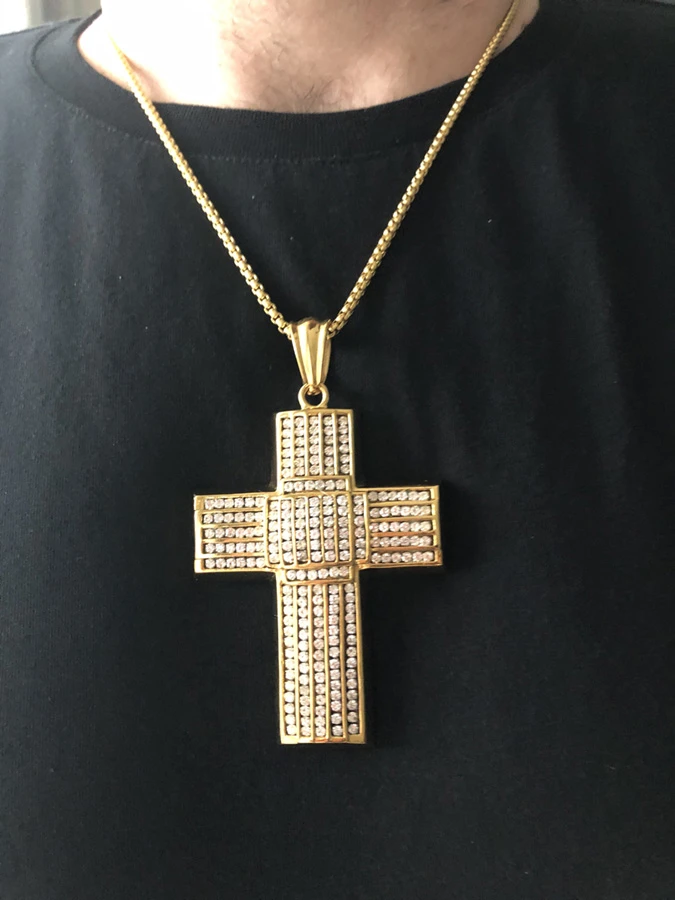 Přívěsek kříž na krk z chirurgické oceli. Masivní přívěšek osázený zirkony. Křížek a řetízek jsou vyrobeny z chirurgické oceli a mají všechny vlastnosti, pro které jsou šperky z chirurgické oceli stále velmi oblíbené v nesčetných řadách uživatelů. K vlastnostem šperků z chirurgické oceli patří odolnost proti poškození, nevyvolávání alergických reakcí, ocelové šperky neoxidují a nemění barvu.
