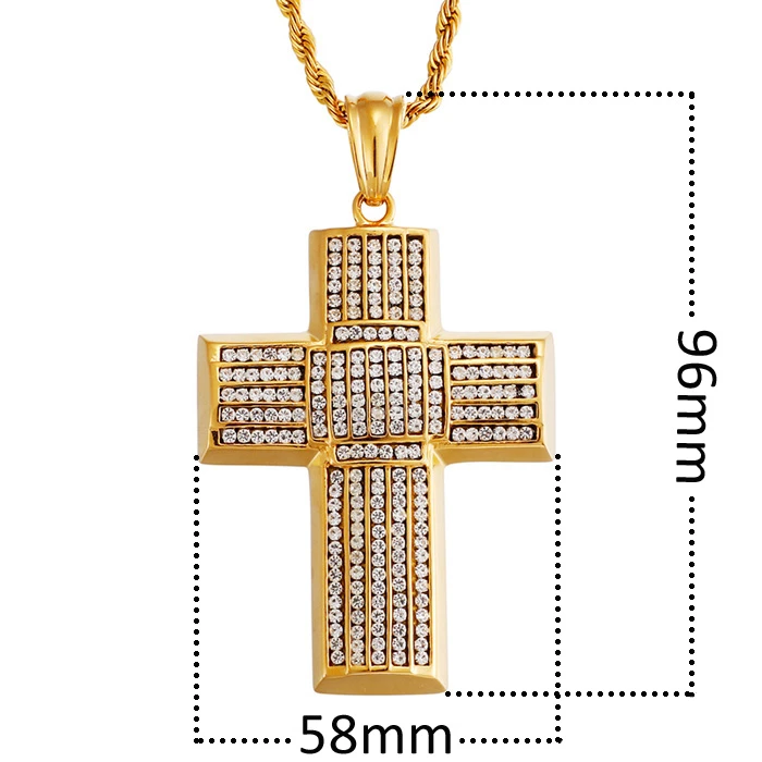 Přívěsek křížek z chirurgické oceli zdobený zirkony. Povrch kříže je pozlacený technologií PVD. Rozměry přívěšku kříže 56x98mm. Uvedené rozměry kříže můžete vidět na podpůrné fotografii. K křížku patří pozlacený řetízek z chirurgické oceli dlouhý 55cm.
