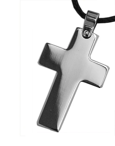 Křížek na krk z chirurgické oceli. Kížek má leštěný povrch s černou. Závěsným očkem na přívěsku lze protáhnout ocelový řetízek s maximálním průměrem 4mm. Rozměr křížku: 34x22mm.