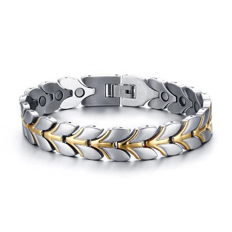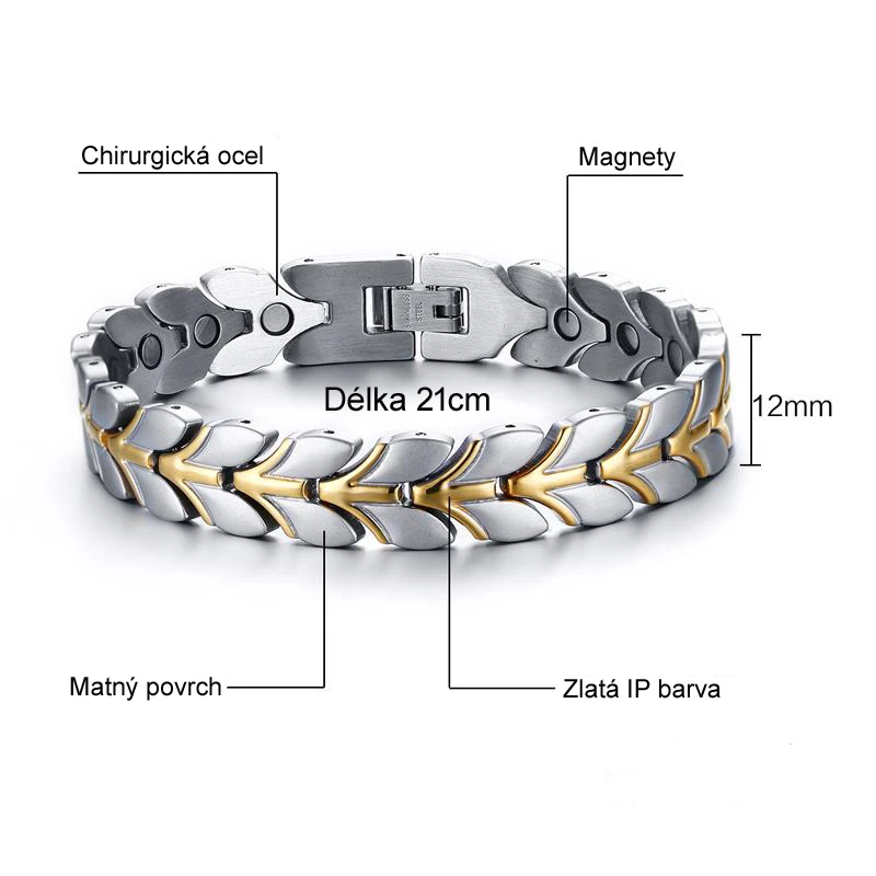 Magnetický náramek z chirurgické oceli. Povrch náramku je matný pouze části upravené zlatou IP barvou jsou leštěné. Náramek je široký 12 mm, délka náramku 21 cm. Na přání je možné délku náramku zdarma zkrátit.