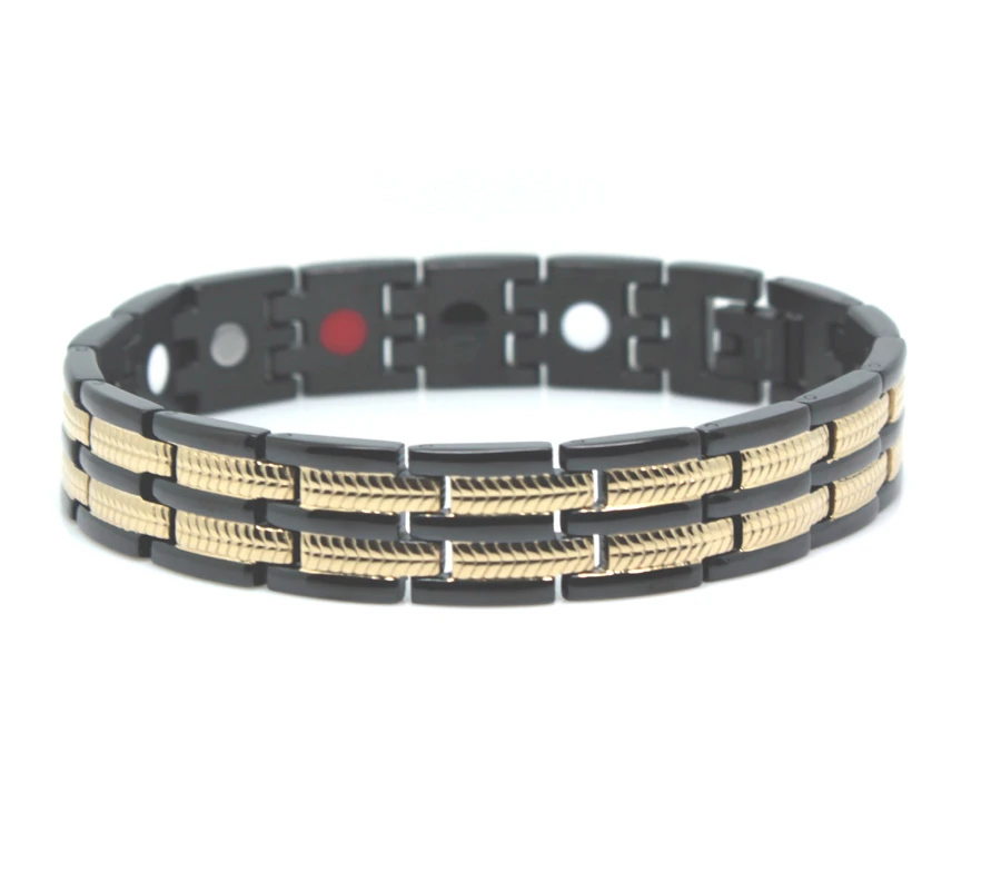 Magnetický náramek na ruku pro muže. Náramek má černý povrch se zlatými proužky Náramek je dlouhý 21,5 cm, šířka náramku 13 mm. Na přání je možné náramek zdarma zkrátit.