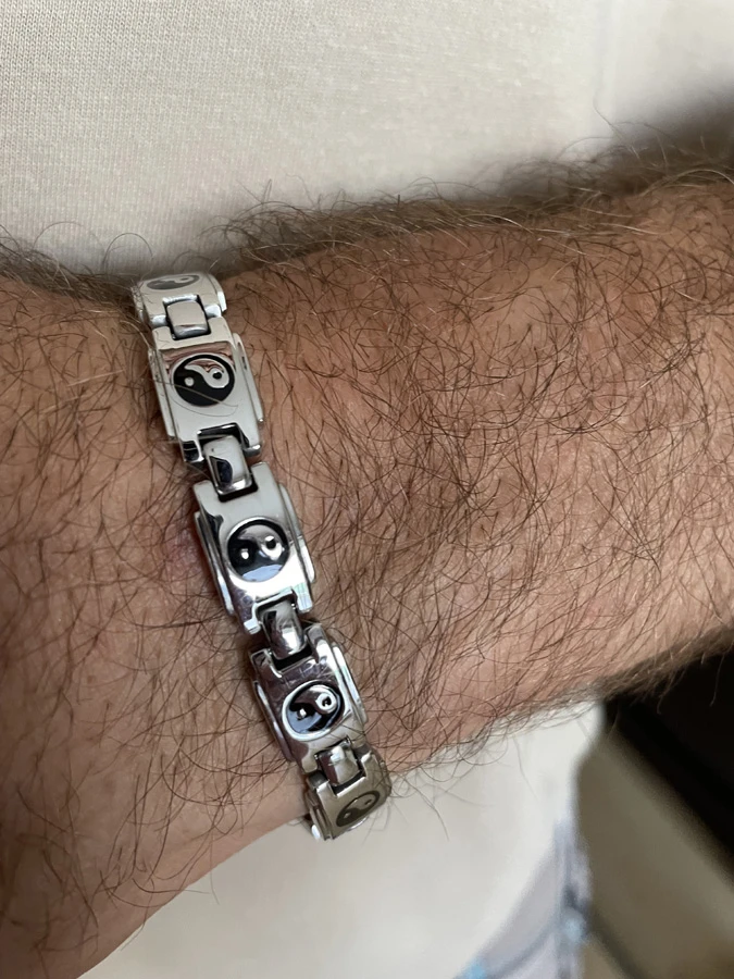 Ocelový náramek na ruku s magnety. Povrch náramku je leštěný s motivem Jin-Jang. Náramek je široký 10 mm, délka náramku 20,5 cm. Délku náramku je možné na přání zdarma zkrátit.