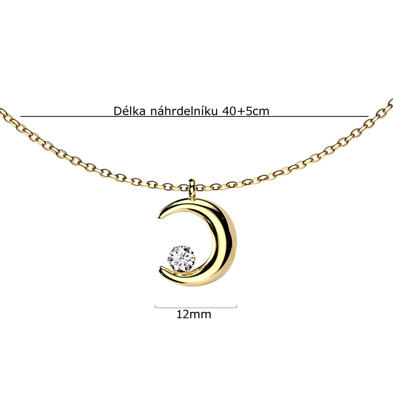 Ocelový náhrdelník se zirkonem. Náhrdelník tvoří řetízek vzoru ankr a přívěsek ve tvaru srpku měsíce. Řetízek má průměr  0,9mm, průměr přívěsku 12mm. Zapínání náhrdelníku je karabinové, délku náhrdelníku lze nastavit v rozmezí 40-45cm.