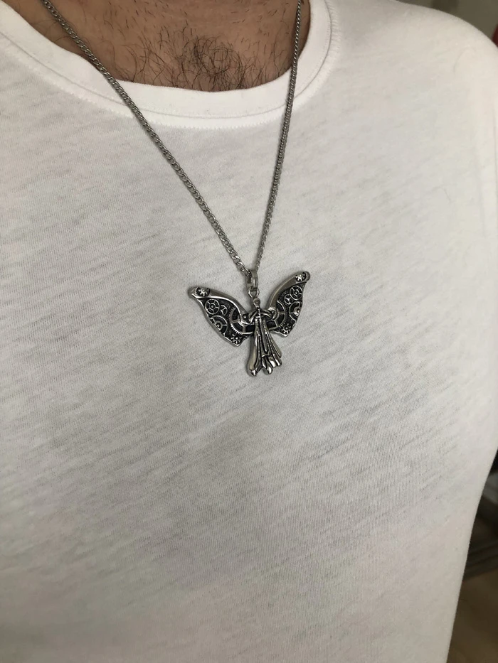 Ocelový přívěsek anděl pomsty s ocelovým řetízkem. Rozměr anděla 35x53mm. Řetízek je dlouhý 60cm.