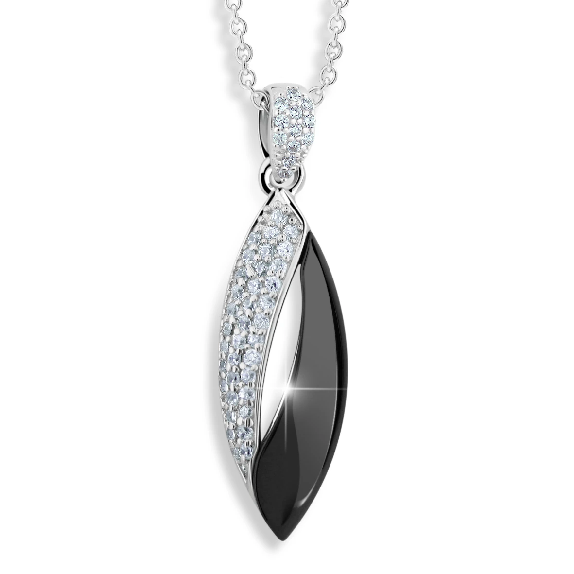 Dámský náhrdelník ze stříbra 925/1000 a hi-tech keramiky. Černá keramická část má hladký lesklý povrch, stříbrná část přívěsku a závěsné očko jsou ozdobené zirkony a mají povrch opatřený vrstvou rhodia. Úprava rhodiováním zaručuje dokonalý a dlouhotrvající vzhled šperku. Rozměr přívěsku: 8x33mm. Náhrdelník je dlouhý 44cm.