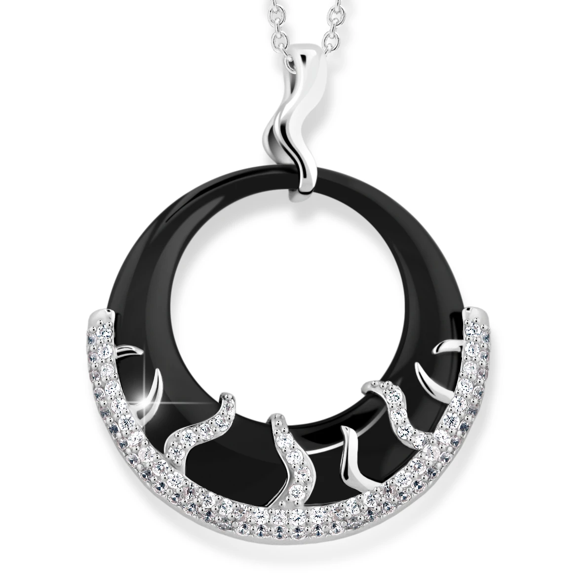 Dámský náhrdelník ze stříbra 925/1000 a hi-tech keramiky. Černá keramická část má hladký lesklý povrch, stříbrná ozdoba se zirkony a závěsné oko a mají povrch opatřený vrstvou rhodia. Úprava rhodiováním zaručuje dokonalý a dlouhotrvající vzhled šperku. Rozměr přívěsku:28x36mm. Náhrdelník je dlouhý 44cm.