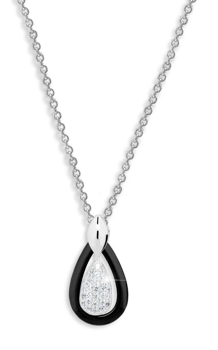 Náhrdelník vyrobený ze stříbra 925/1000 a hi-tech keramiky. Povrch černého keramického oválku je hladký leštěný, stříbrná ozdoba osazená zirkony má porhodiovaný povrch. Úprava rhodiováním zaručuje dokonalý a dlouhotrvající vzhled šperku. Náhrdelník je dlouhý 44cm. Rozměr přívěsku 10x18mm.