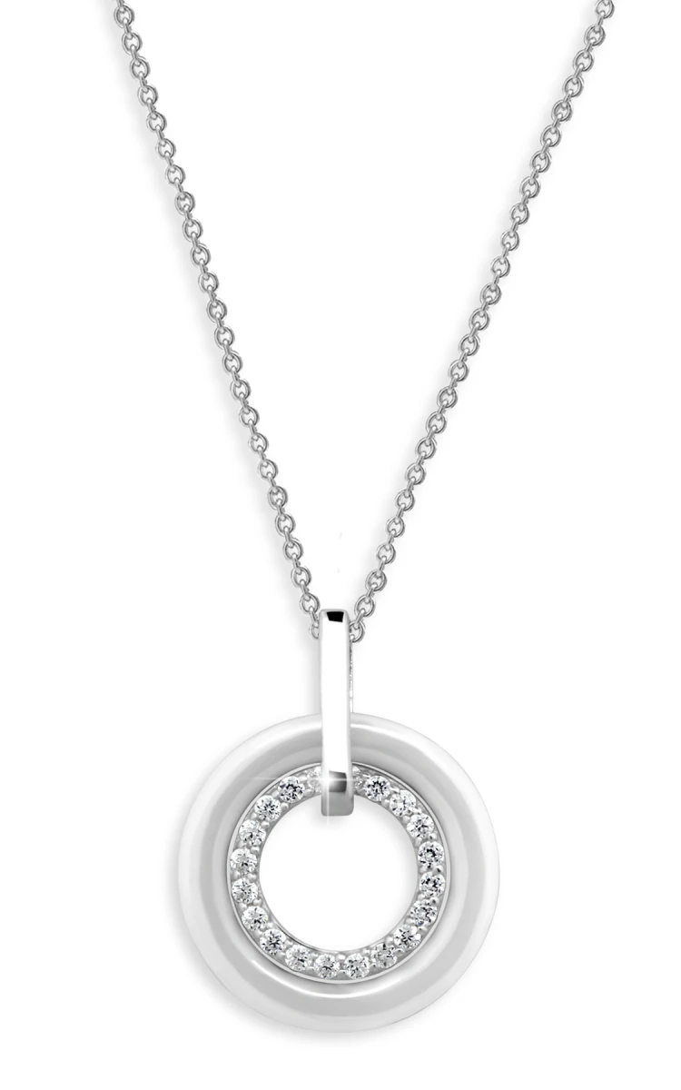 Náhrdelník vyrobený ze stříbra 925/1000 a hi-tech keramiky. Povrch bílého keramického kroužku je hladký leštěný, stříbrný kroužek se zirkony má porhodiovaný povrch, stejně tak jako závěsné očko. Úprava rhodiováním zaručuje dokonalý a dlouhotrvající vzhled šperku. Náhrdelník je dlouhý 44cm. Rozměr přívěsku 18x23mm.