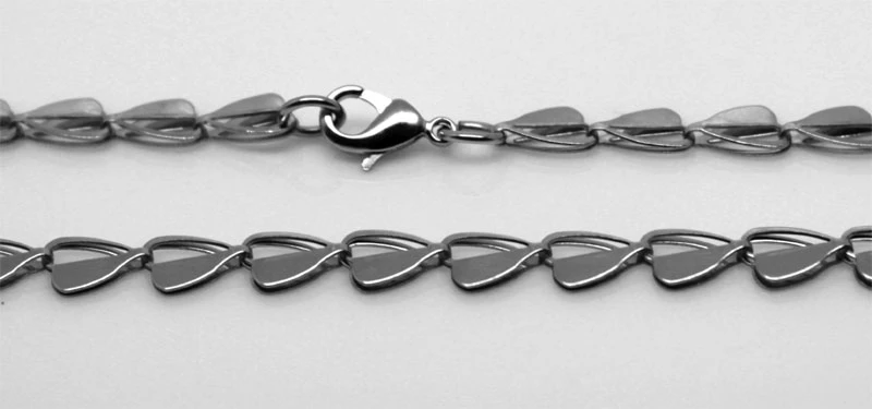 Ocelový dámský náhrdelník. Náhrdelník má leštěný povrch. Zapínání je karabinové. Články mají tvar lístečků. Rozměr článků 9x6mm.