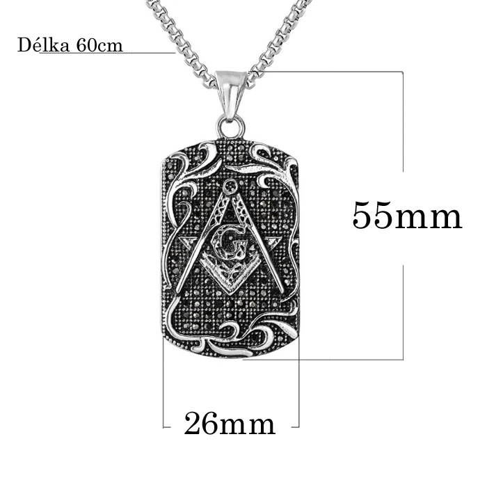 Řetízek a přívěšek z chirurgické oceli. Povrch přívěsku je plastický se symbolem Svobodných zednářů. Ocelový řetízek se zapínáním na karabinu je dlouhý 60cm, průměr řetízku 2,8mm.