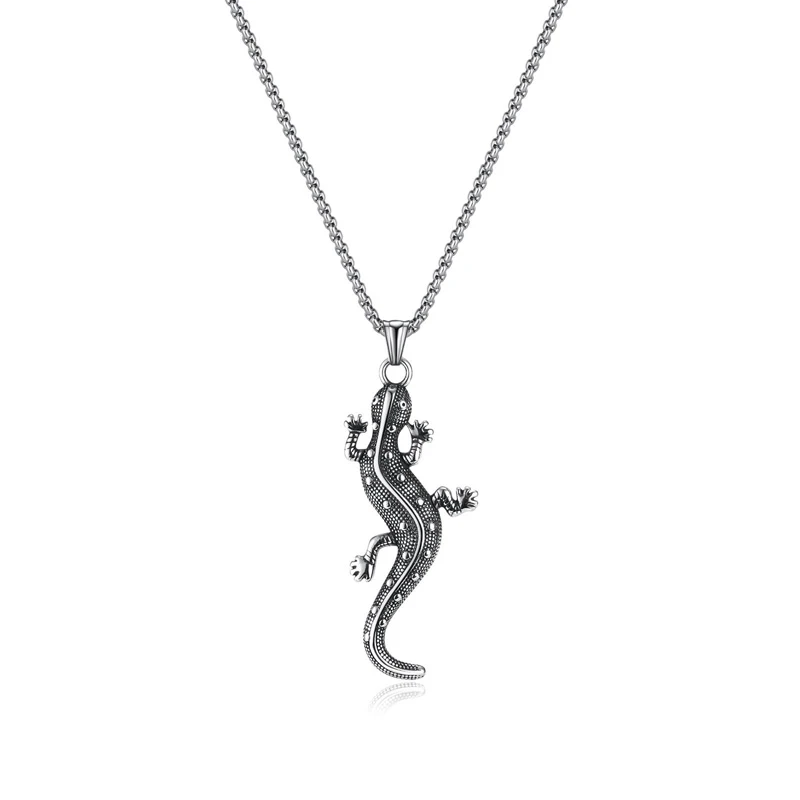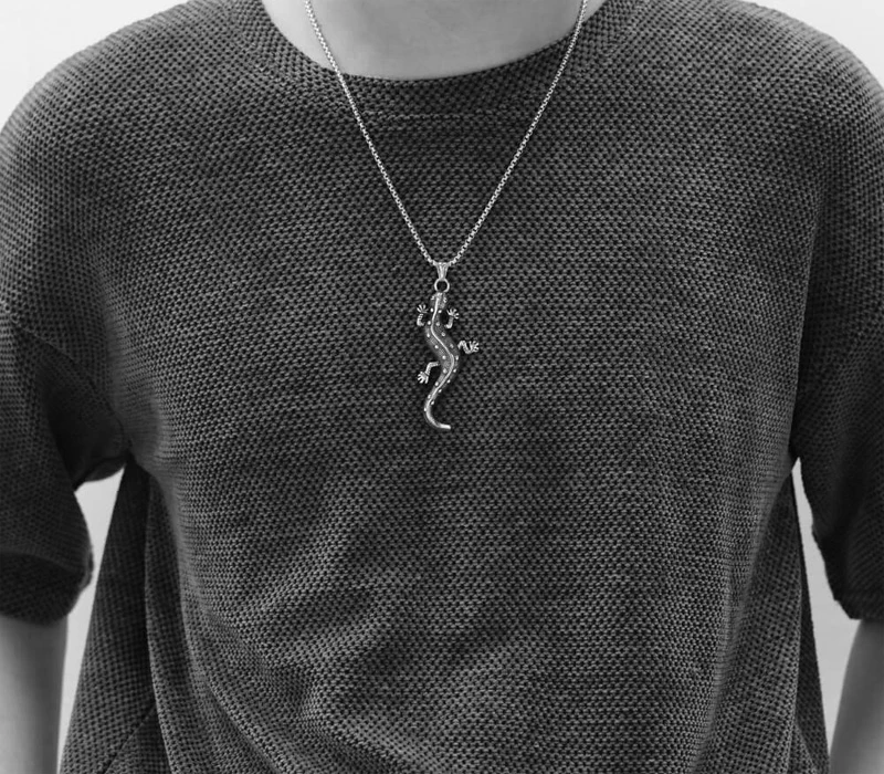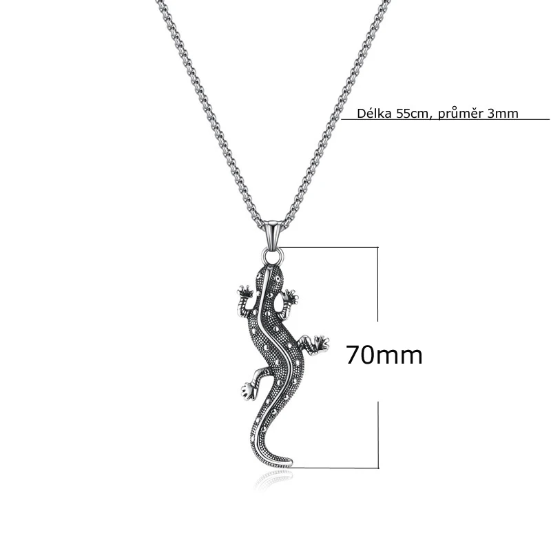 Ocelový náhrdelník s přívěskem ještěrky. Ještěrka je dlouhá 70mm. K ještěrce patří ocelový řetízek dlouhý 55cm s průměrem 3mm.