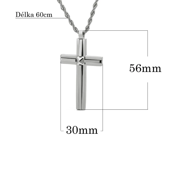 Přívěsek křížek a řetízek z chirurgické oceli. Ocelový řetízek se zapínáním na karabinu je dlouhý 60cm, průměr 2,8mm. Rozměr kříže 56x30mm.