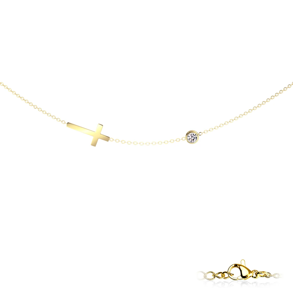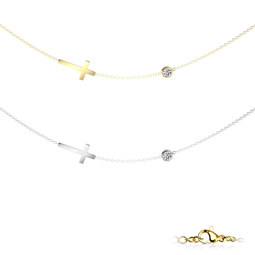 Jemný ocelový náhrdelník ozdobený křížkem a zirkonem. Povrch náhrdelníku je leštěný. Křížek je dlouhý 19mm, průměr ozdoby se zirkonem 6,0mm. Délku náhrdelníku lze nastavit v rozmezí 42-45cm.