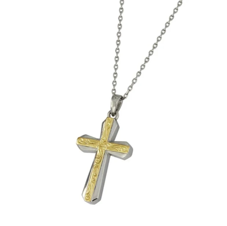 Přívěsek křížek odlitý z chirurgické oceli a řetízek tvořící jeden celek. Pohledová strana křížku je ozdobená rytým vzorem. Ke křížku náleží řetízek z chirurgické oceli vzor ankr dlouhý 55cm se zapínáním na karabinu.