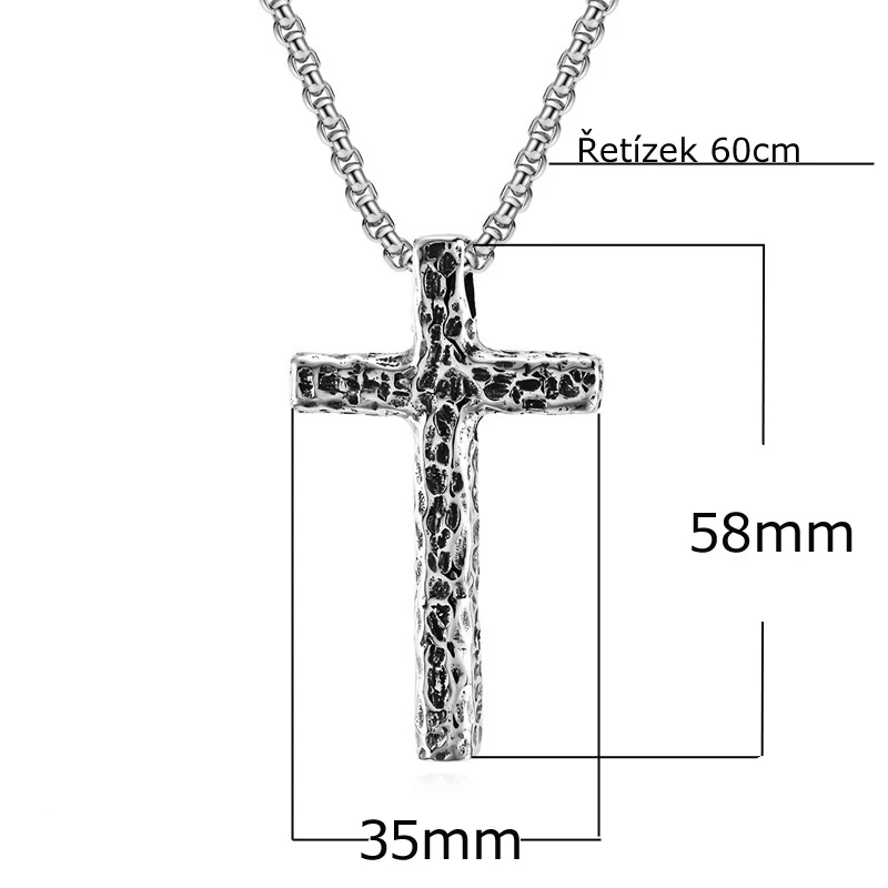 Ocelový náhrdelník kříž. Povrch křížku je leštěný s plastickým vzorem. Řetízek s průměrem 3mm je dlouhý 60cm. Výška křížku 58mm, šířka 35mm.