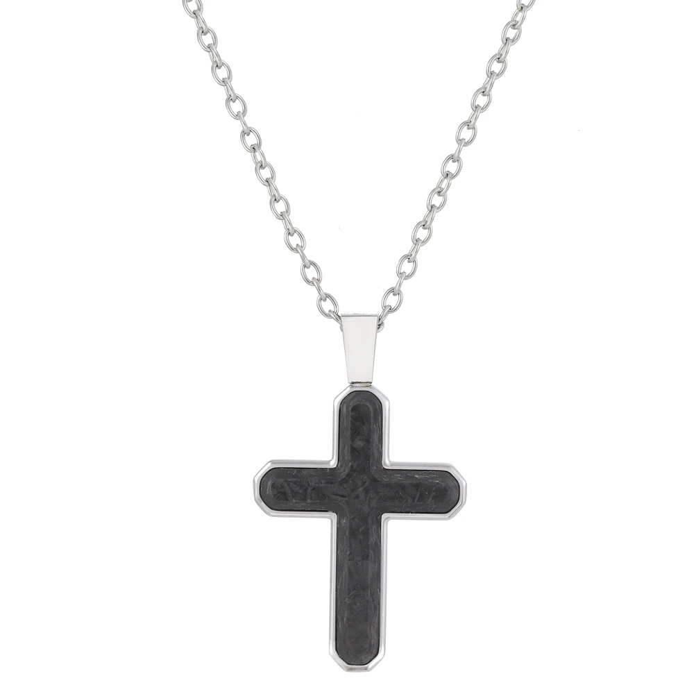 Ocelový náhrdelník křížek. Povrch křížku je leštěný, křížek je ozdobený kovaným uhlíkem. Rozměr křížku 36x26mm. Ocelový řetízek má očka široká 2,6mm, délka řetízku 55cm. Zapínání řetízku je karabinové.