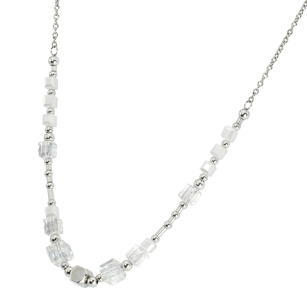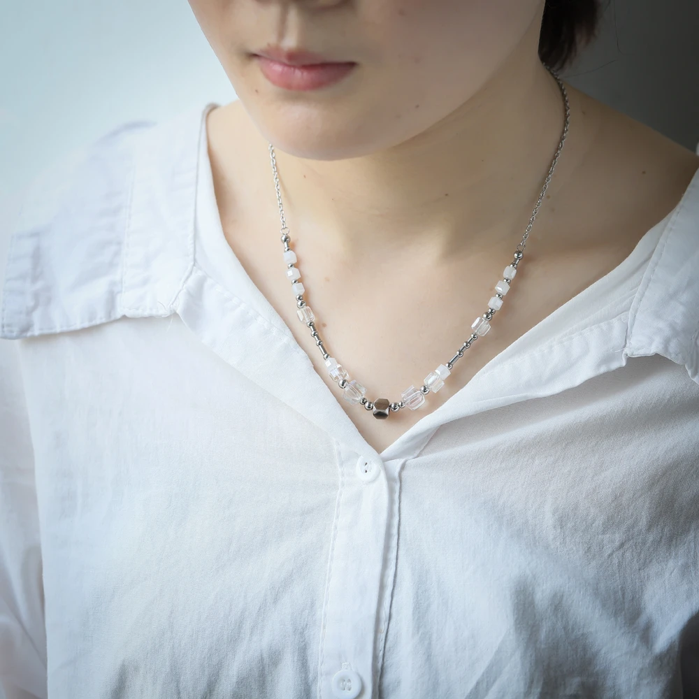 Náhrdelník z chirurgické oceli se skleněnými korálky. Povrch ocelových částí náhrdelníku je leštěný. Skleněné korálky jsou průhledné a bílé. Větší korálky mají rozměr 7x7mm, menší korálky mají rozměr 6x6mm a 4x4mm. Délku náhrdelníku lze nastavit v rozmezí 45-50cm.