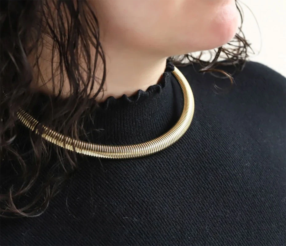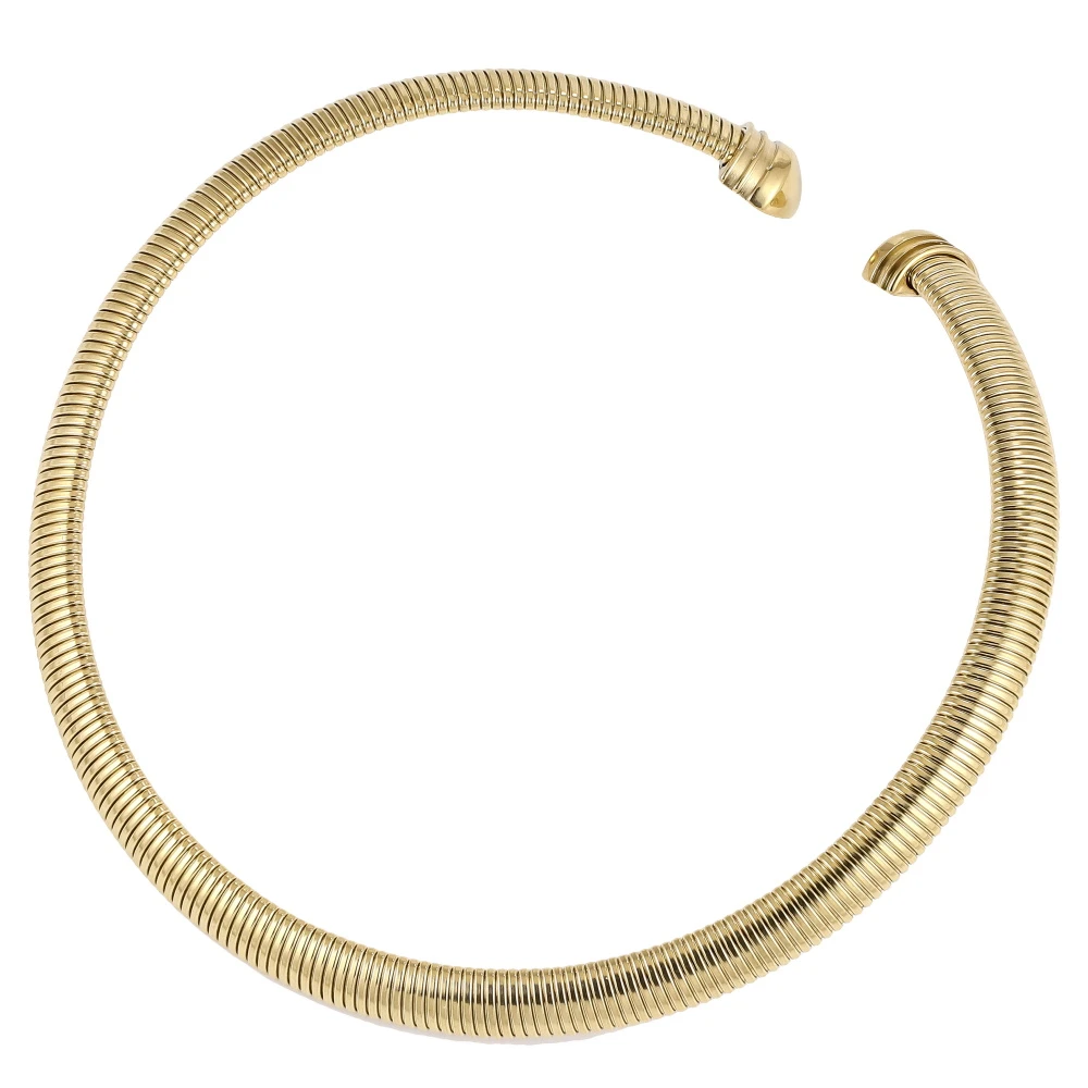 Pevný ocelový náhrdelník. Pozlacený povrch náhrdelníku je leštěný. Vnitřní průměr náhrdelníku 130mm, šířka 10mm.