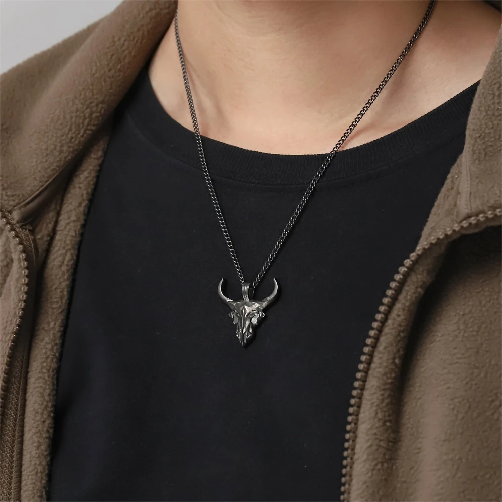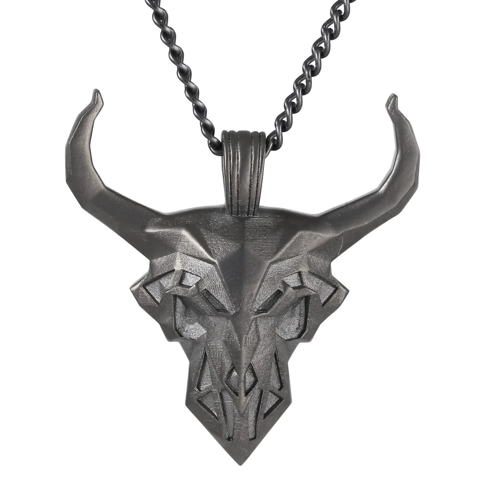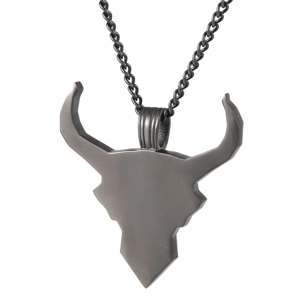 Náhrdelník z chirurgické oceli s ozdobou ve tvaru býčí hlavy. Náhrdelník je dlouhý 55cm, šířka řetízku 4,5mm. Hlava býka má rozměr 29x28mm. Povrch náhrdelníku je v barvě pistolové šedi. Délku náhrdelníku lze na přání zdarma zkrátit